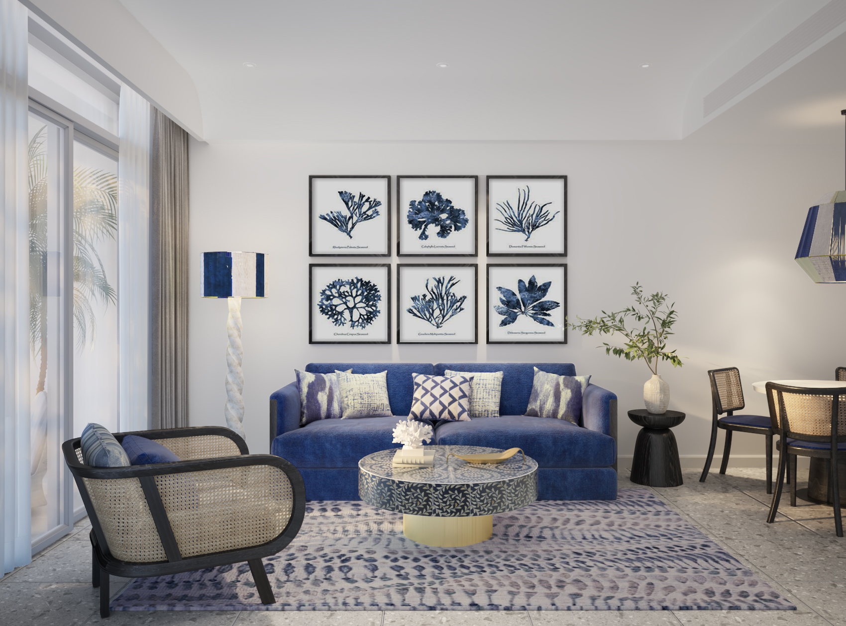 • Sàn phòng khách lát đá Terrazzo tạo cảm giác như đang bước trên bãi cát, các tone màu nội thất thì là các tone màu mạnh như xanh nước biển, cam, xanh lá cây…